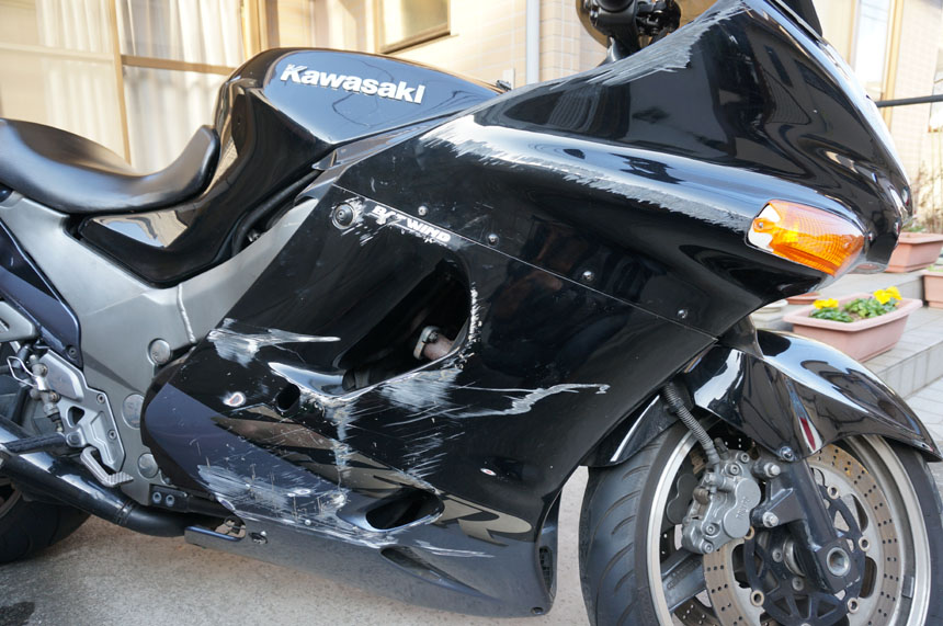改めてボロボロの右側。ウィンカー割れてるのは…まあおいとこう。