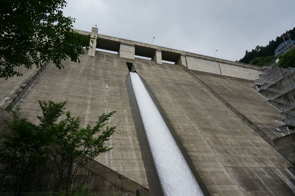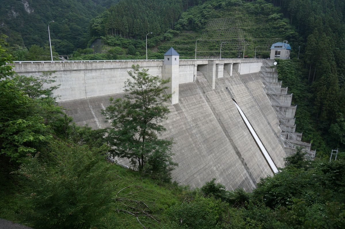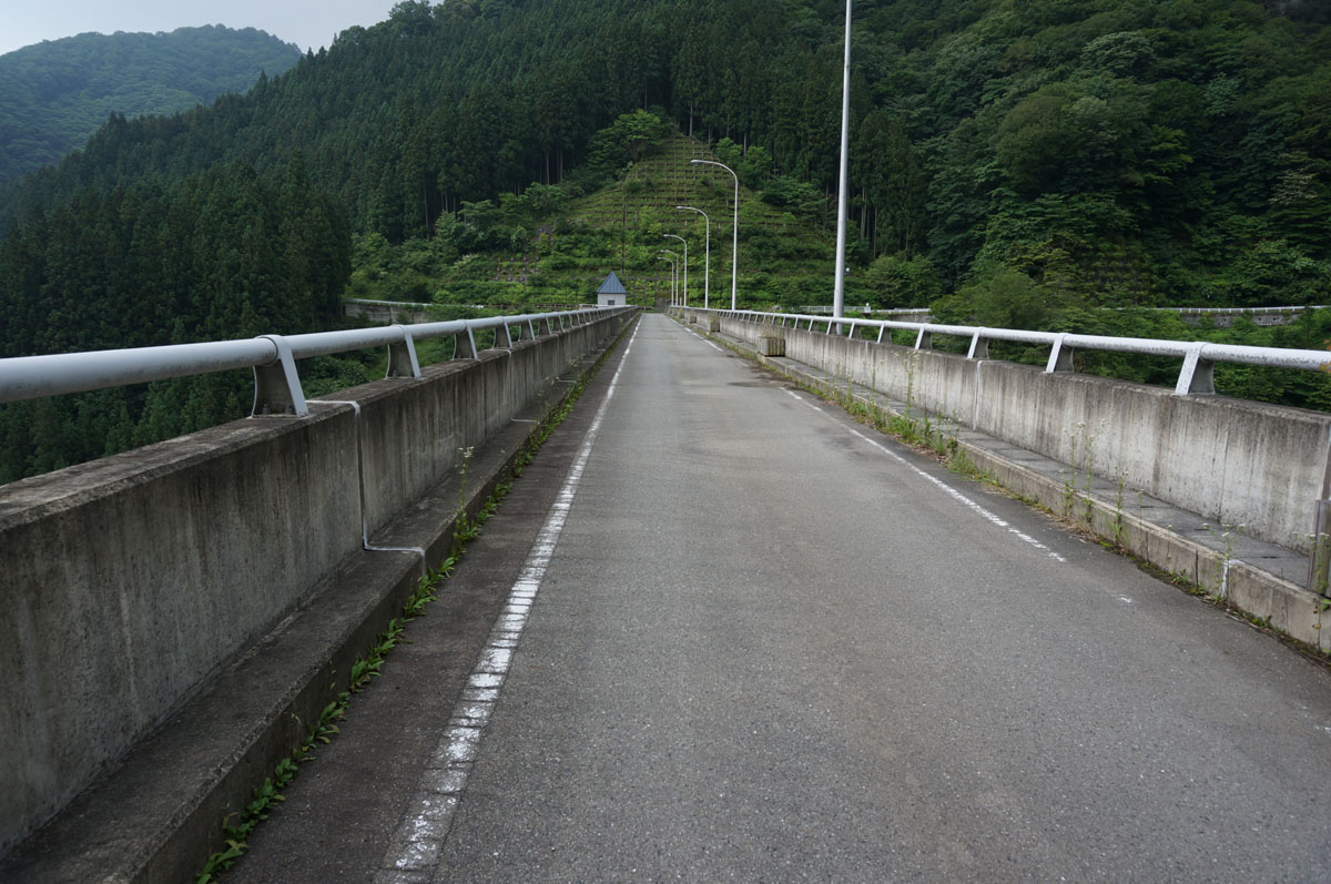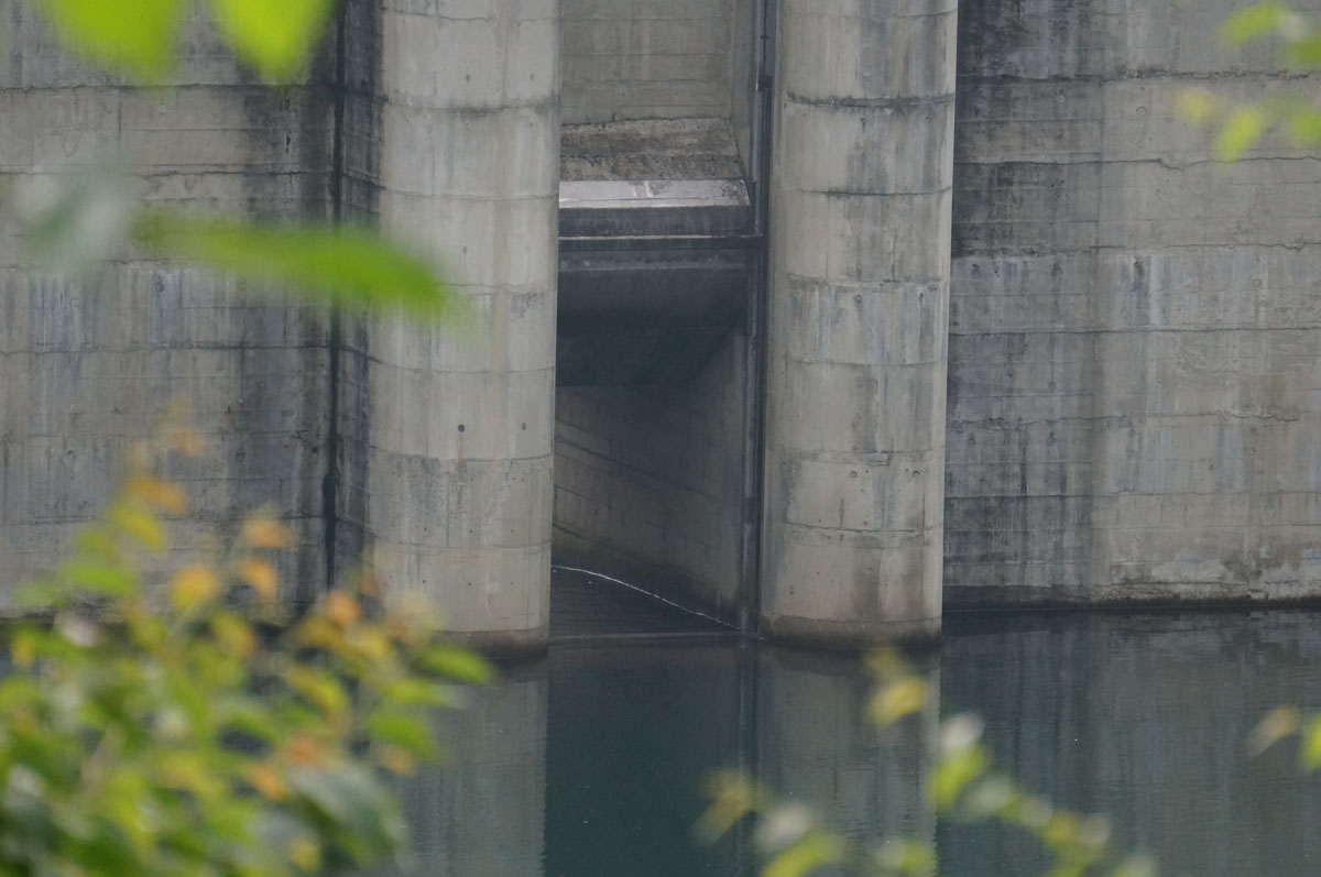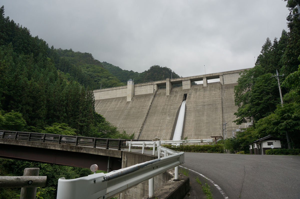 堤体の真ん中にある三角屋根は水位計らしい。