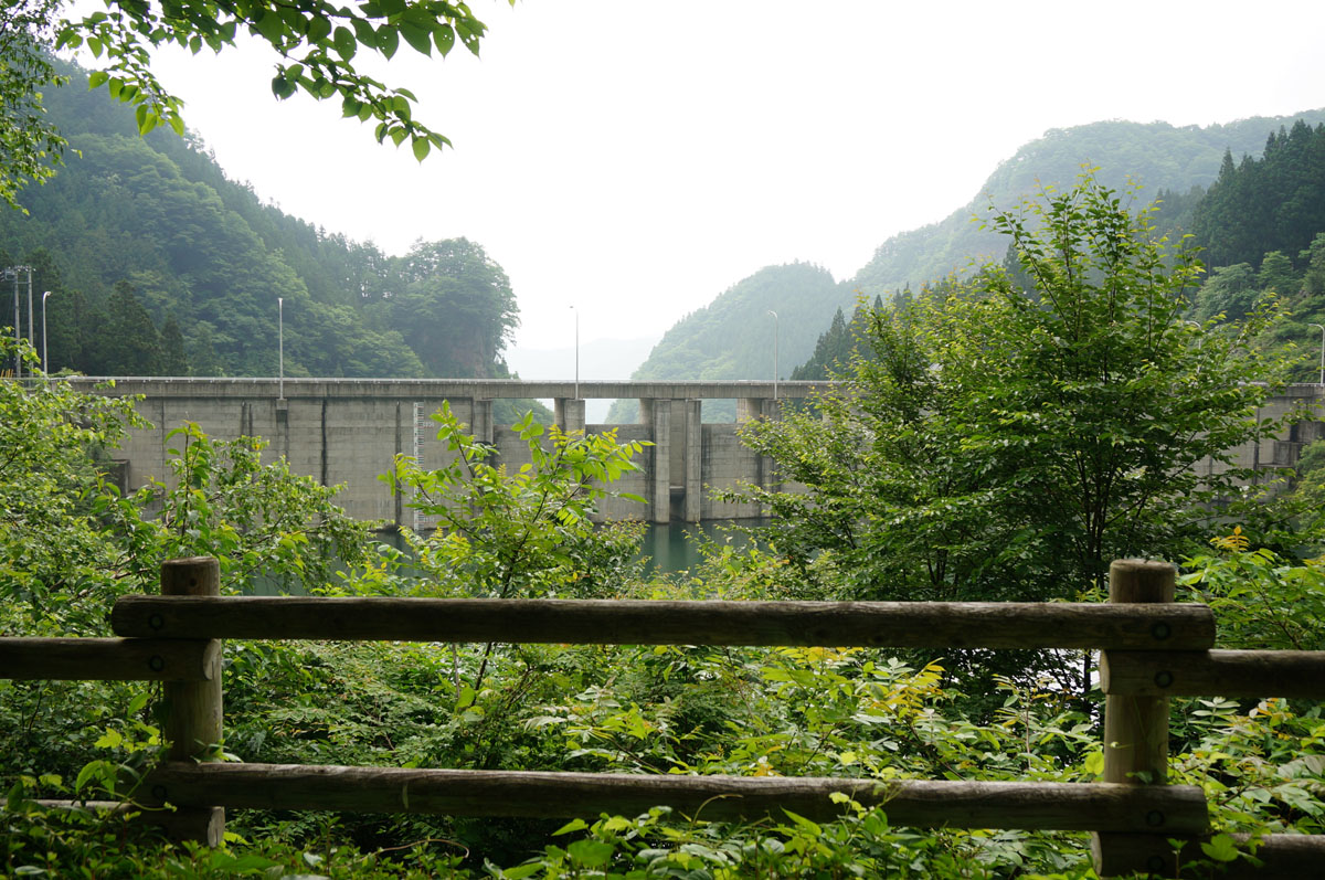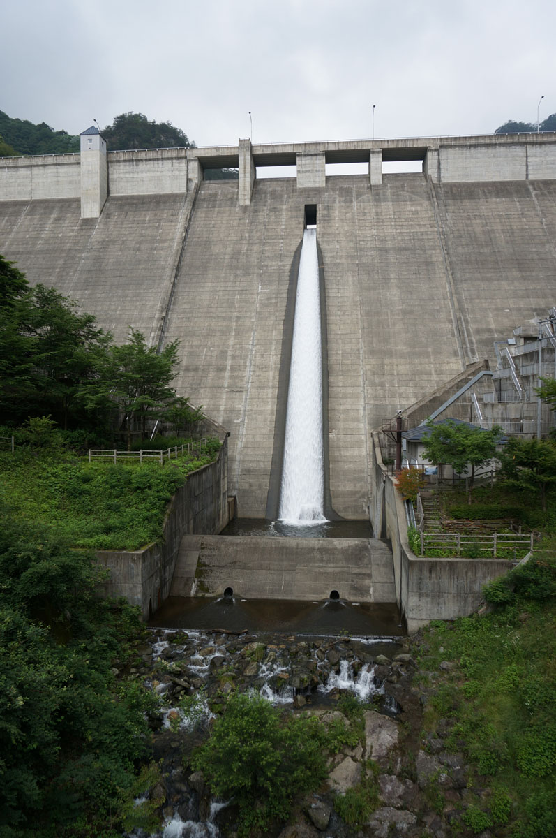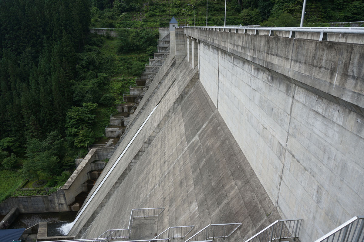 左岸から。管理所の前辺りから堤体を眺める。