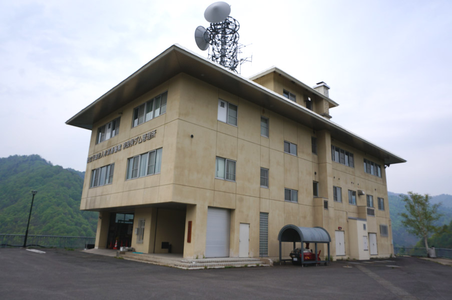 管理所で一応ダムカードを貰う。管理所の駐車場から見た堤体。