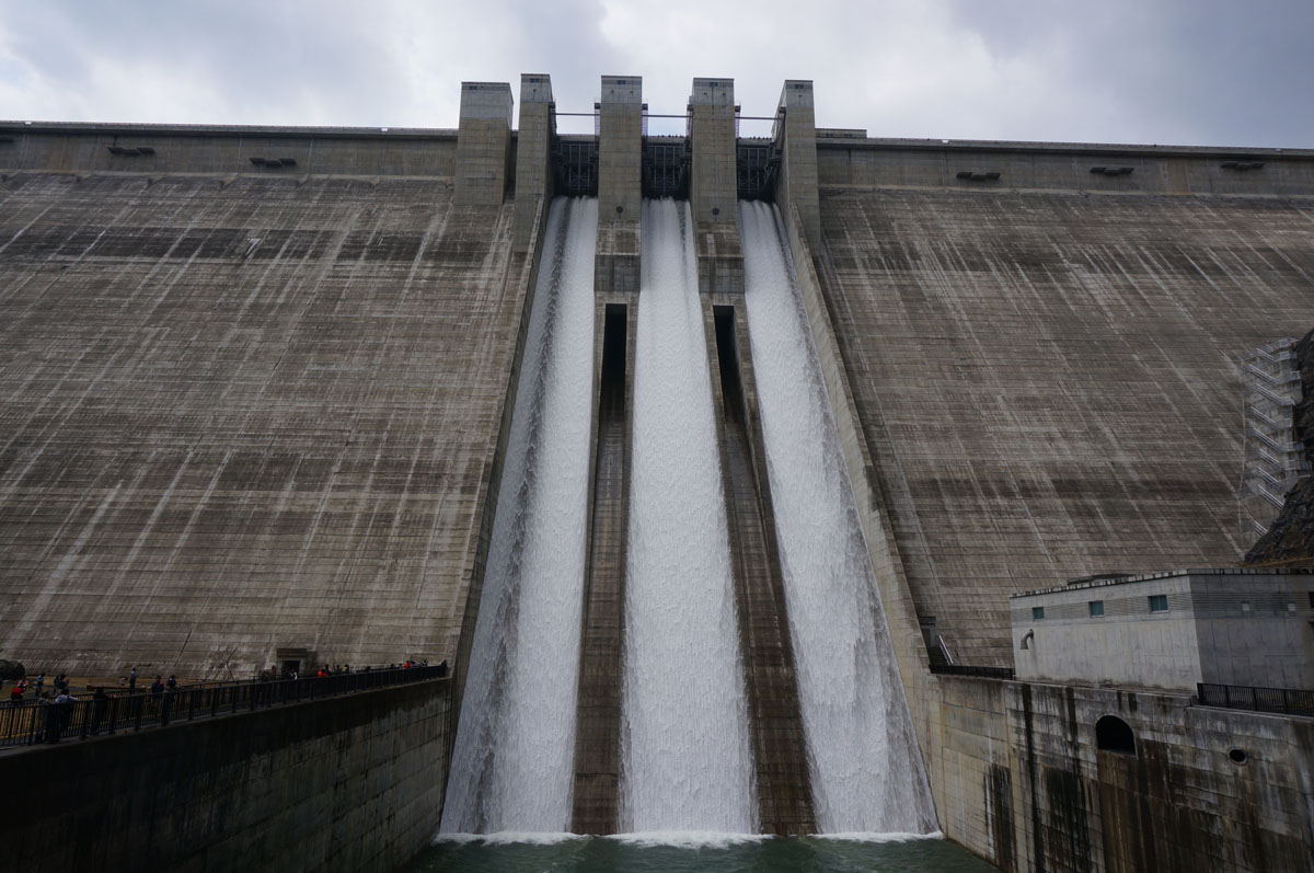 ダムが一望。とんでもない量の水煙は、結構本気でバルブから放流していて