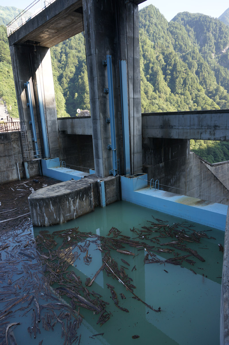 ダム湖を望む。前日までの雨のせいか流木が大量。