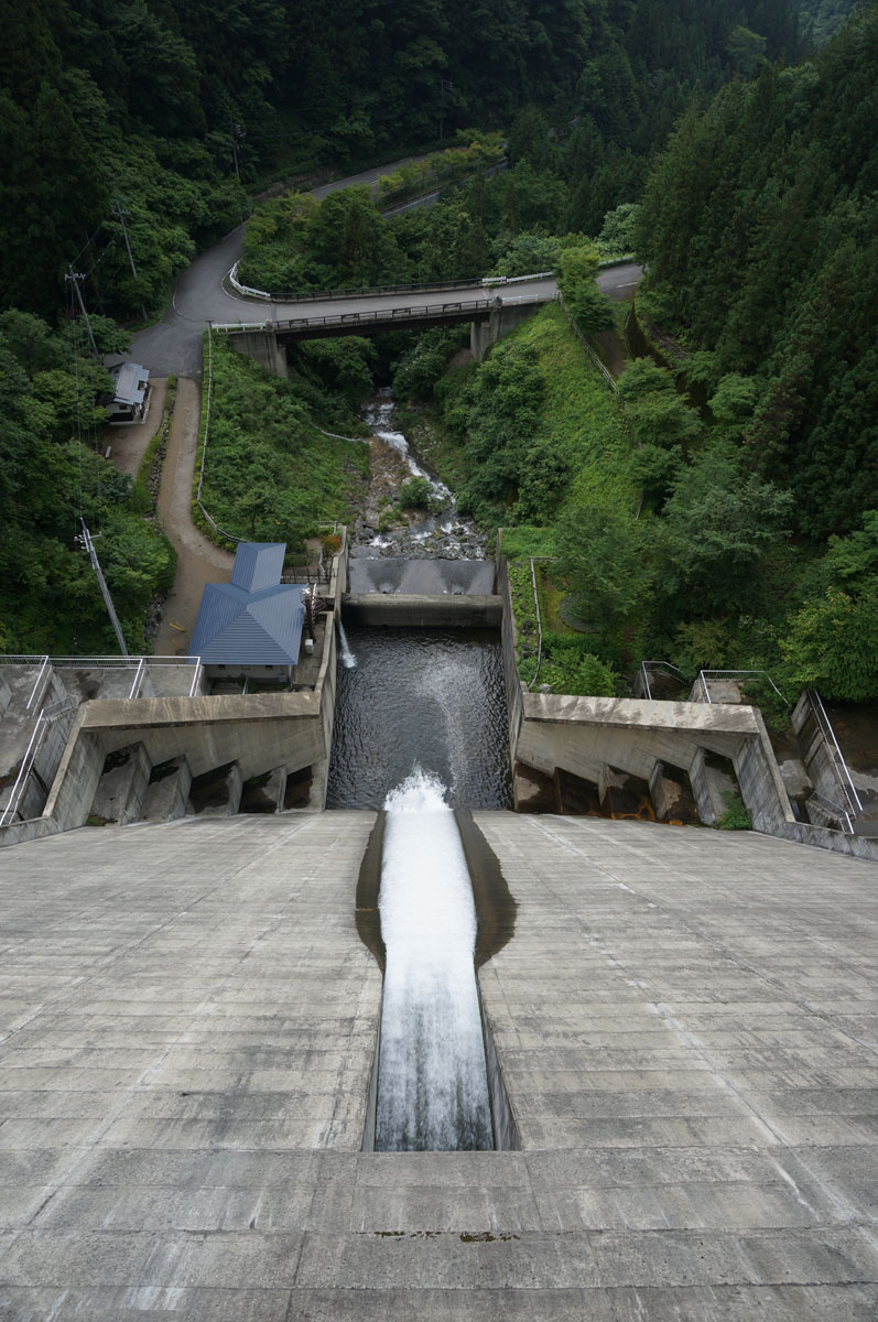 堤体の真ん中にある三角屋根は水位計らしい。