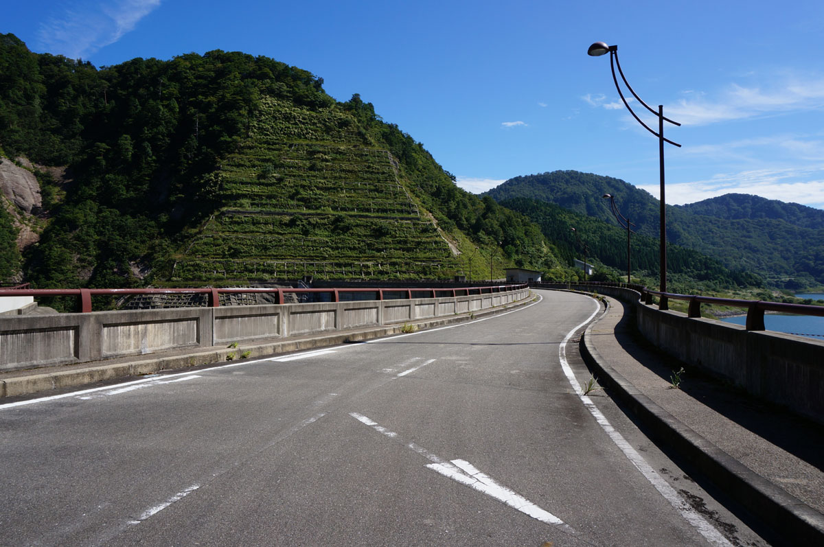 この道を真っ直ぐ進むと、奥三面ダム湖・あさひ湖を沿ってから南へ向かって