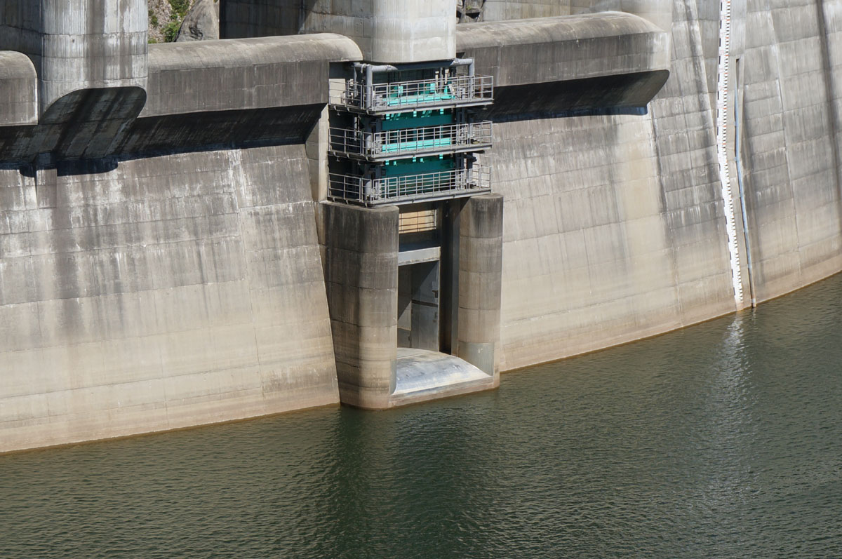 自然越流式のクレストの間に、オリフィスのローラーゲートが見えます。