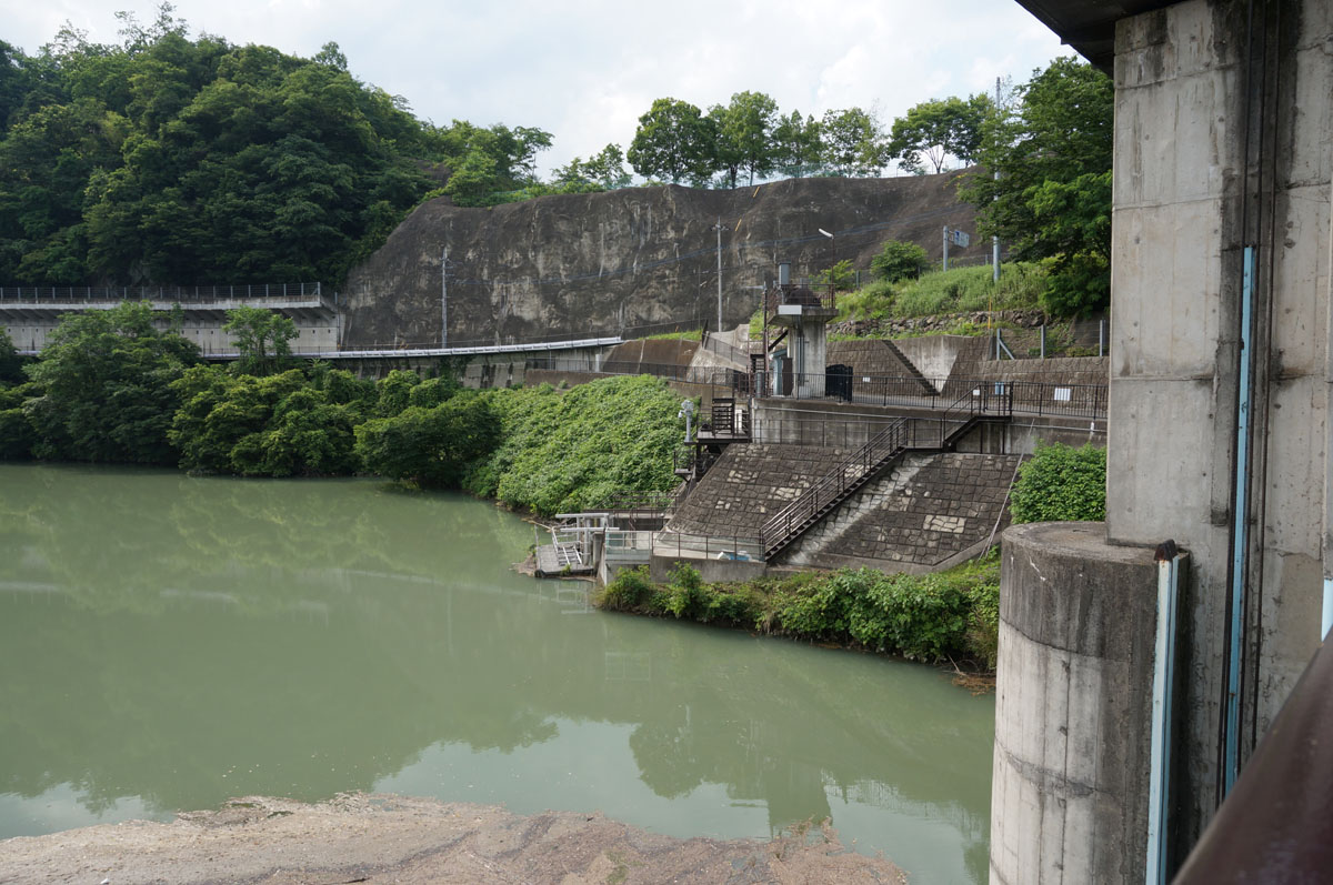 ダム湖側から見たところ。下に見え隠れしてるのが貸しボート。