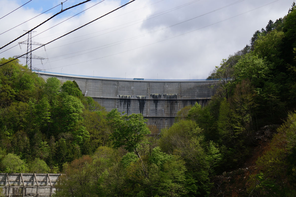 ロックフィルダムの堤高で日本第三位。離れてもこの存在感。