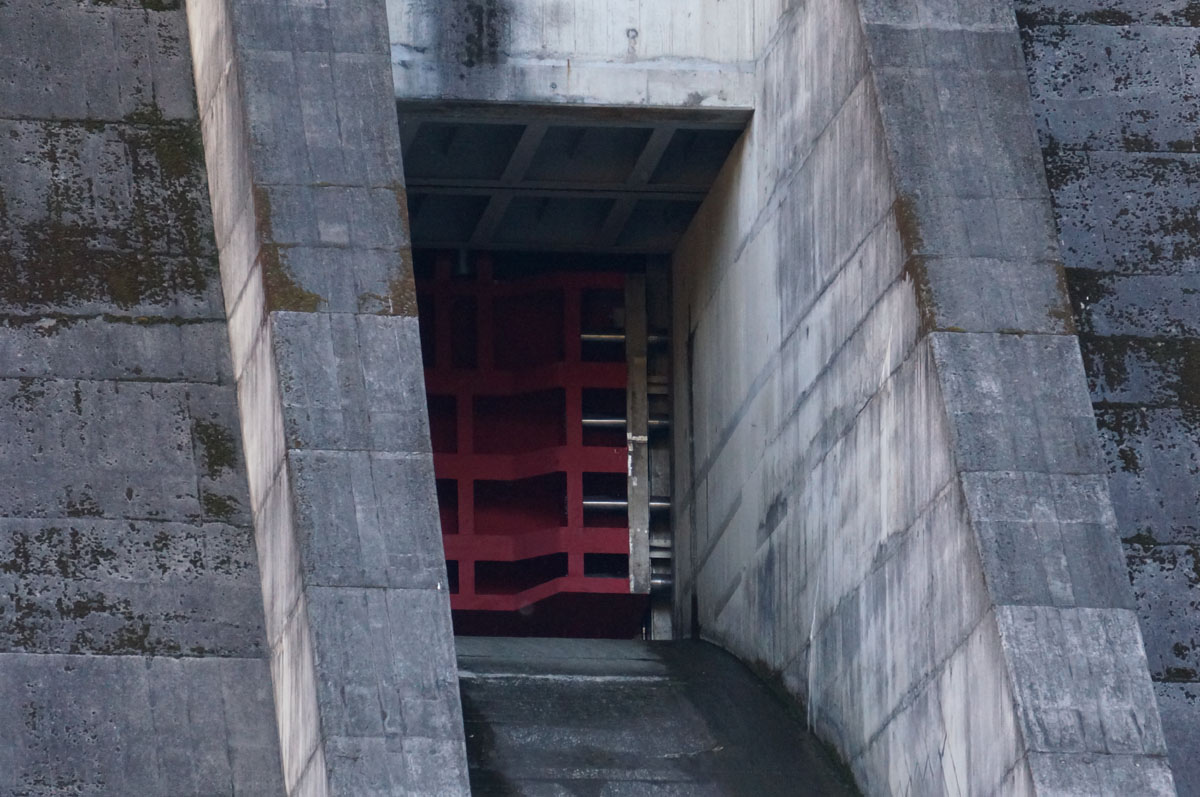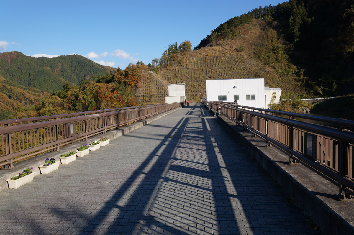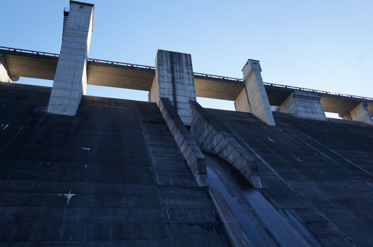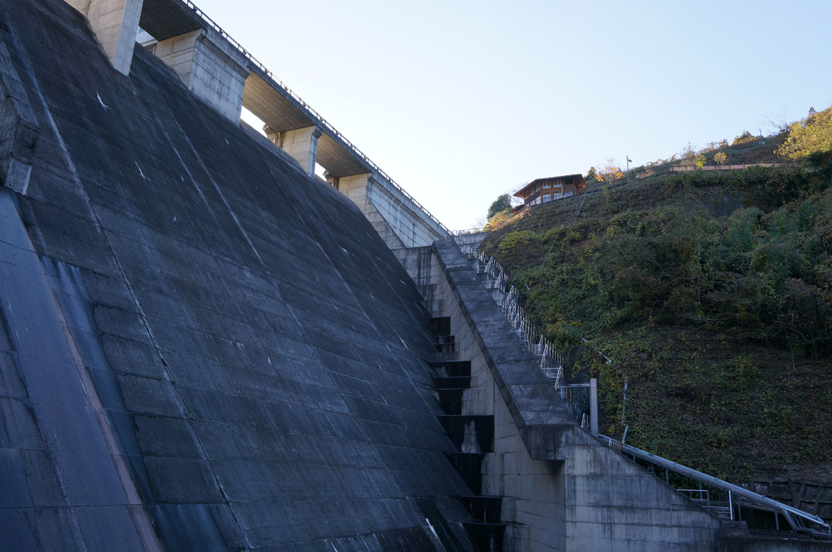 桃子視点のダム堤体。真ん中に取水設備。クレストは自然越流式だ。