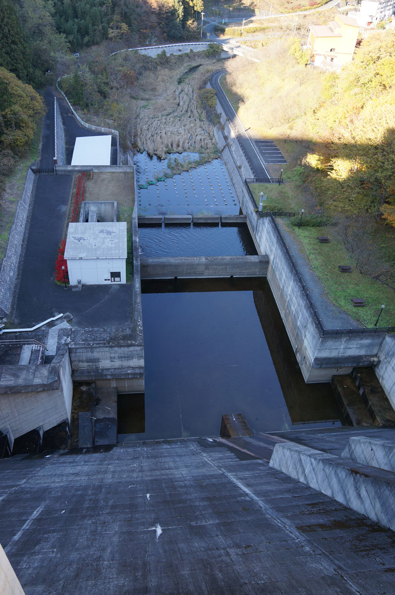 覗きこむとこんな感じ。副ダムが二段構え。その向こうもブロックが敷き詰められている。