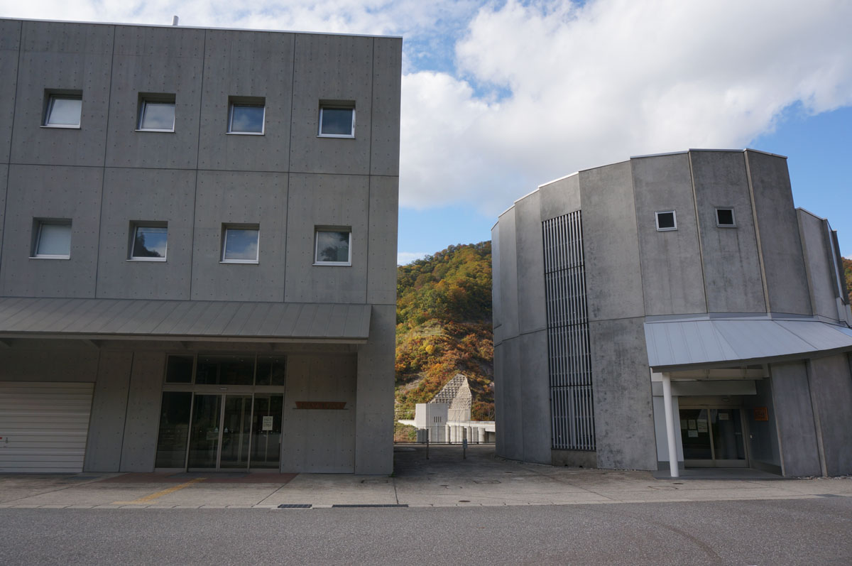 下流面。堤体のすぐ下にある建物は日中温泉。ダムの麓で宿泊出来るとは。