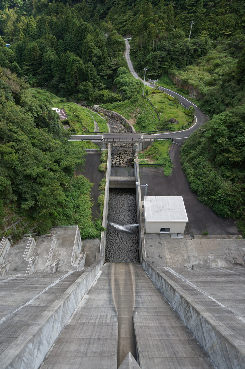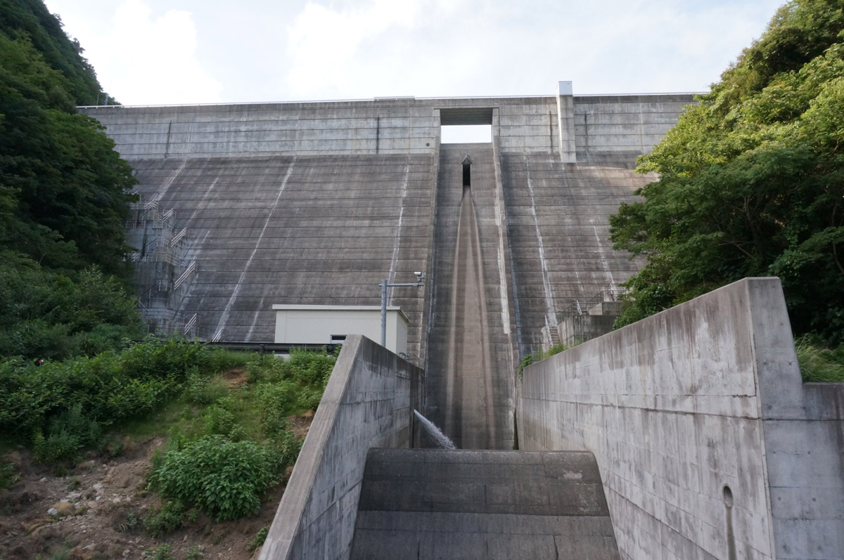 ダム湖側から堤体を眺める。洪水吐はシンプルそのもの。ゲートレスだ。