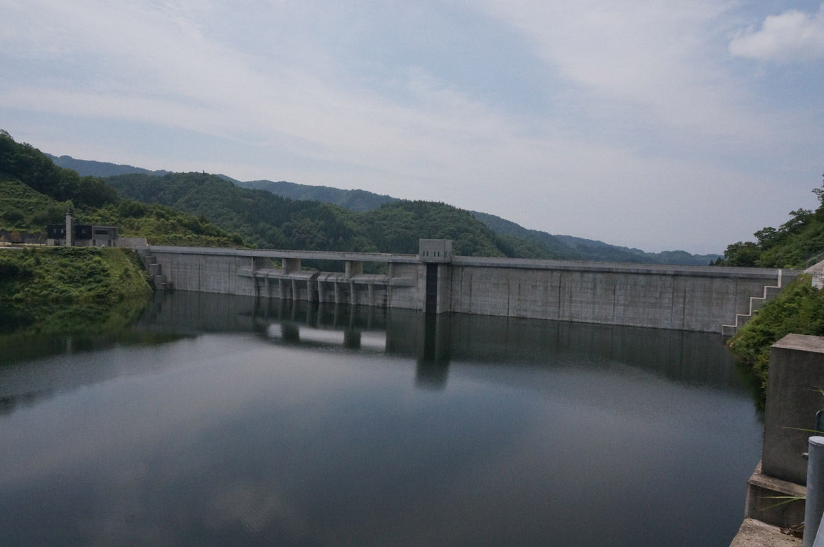湖側から堤体を眺める。自然越流式の洪水吐と