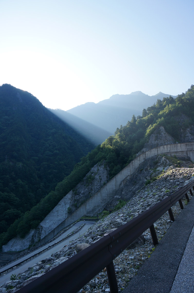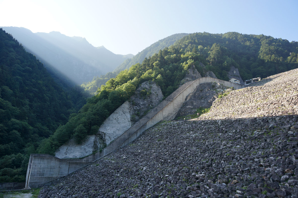 洪水吐の急傾斜の感じや、山を越えて朝陽が差し込む様が綺麗だったので停めてもらった。ありがとう。