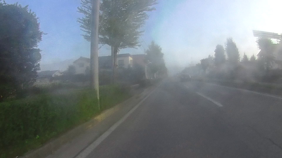 レンズが既に濡れてるってのもあるけど、朝靄の中を突っ走る。