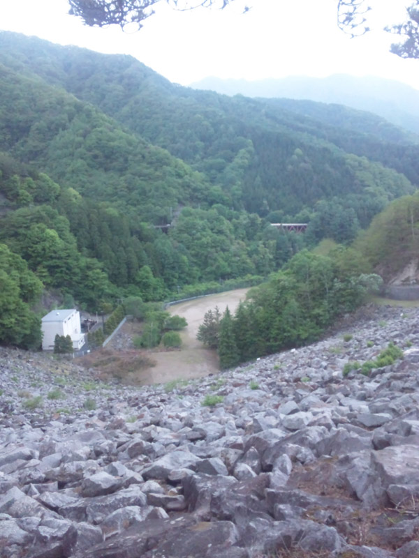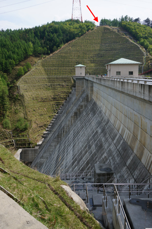 真っ正面がロックフィルの堤体、右に見えるのが洪水吐のゲート。